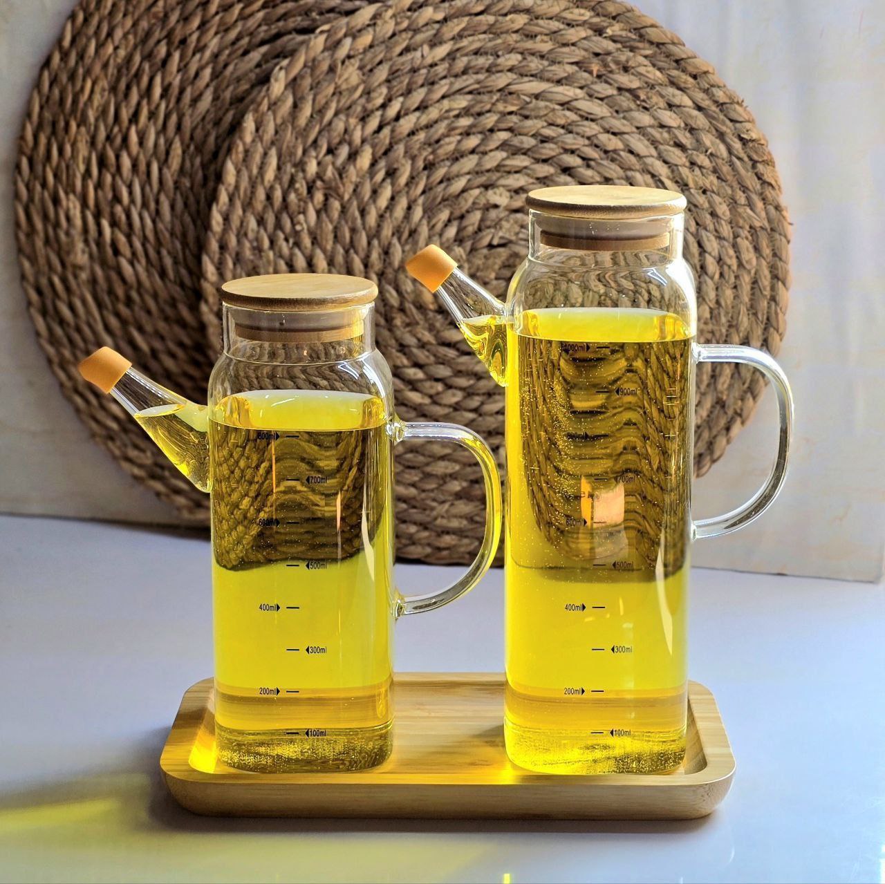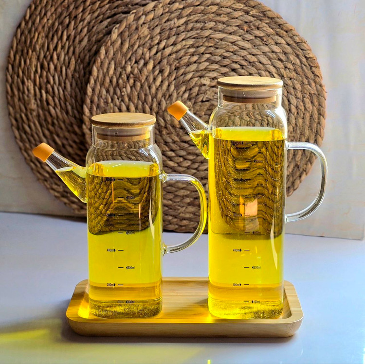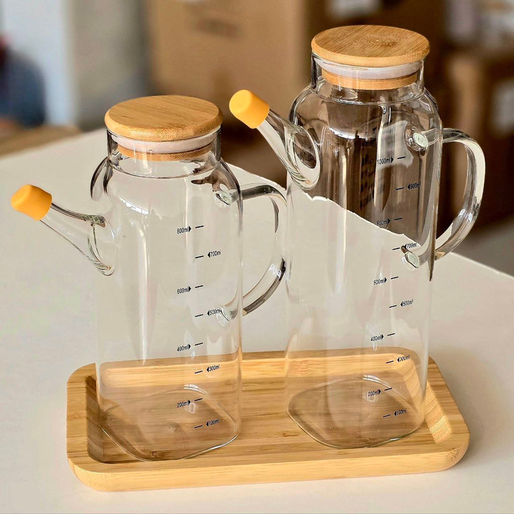 روغنریز پیرکس با درب بامبو، یک ظرف شیک و کاربردی برای سرو و نگهداری روغن، سرکه و سسهای مایع در آشپزخانهست. بدنه پیرکس شفاف باعث میشه میزان روغن همیشه قابل مشاهده باشه و بهخاطر مقاومت بالا در برابر حرارت و لک، کاملاً بهداشتی و بادوامه.