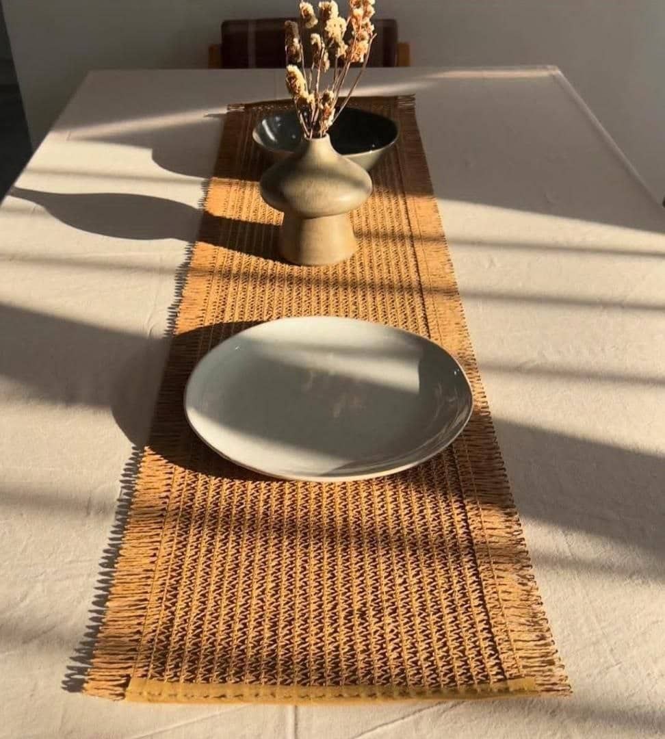 رانر کنفی با بافت طبیعی و ظاهر گرم و جذابش، یکی از محبوبترین اکسسوریهای دکور میز در سبکهای مینیمال، بوهو و روستیک به حساب میآید.