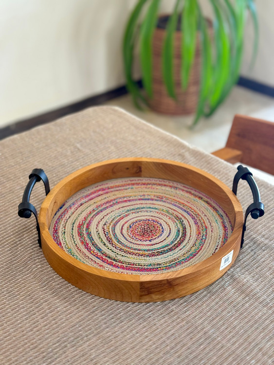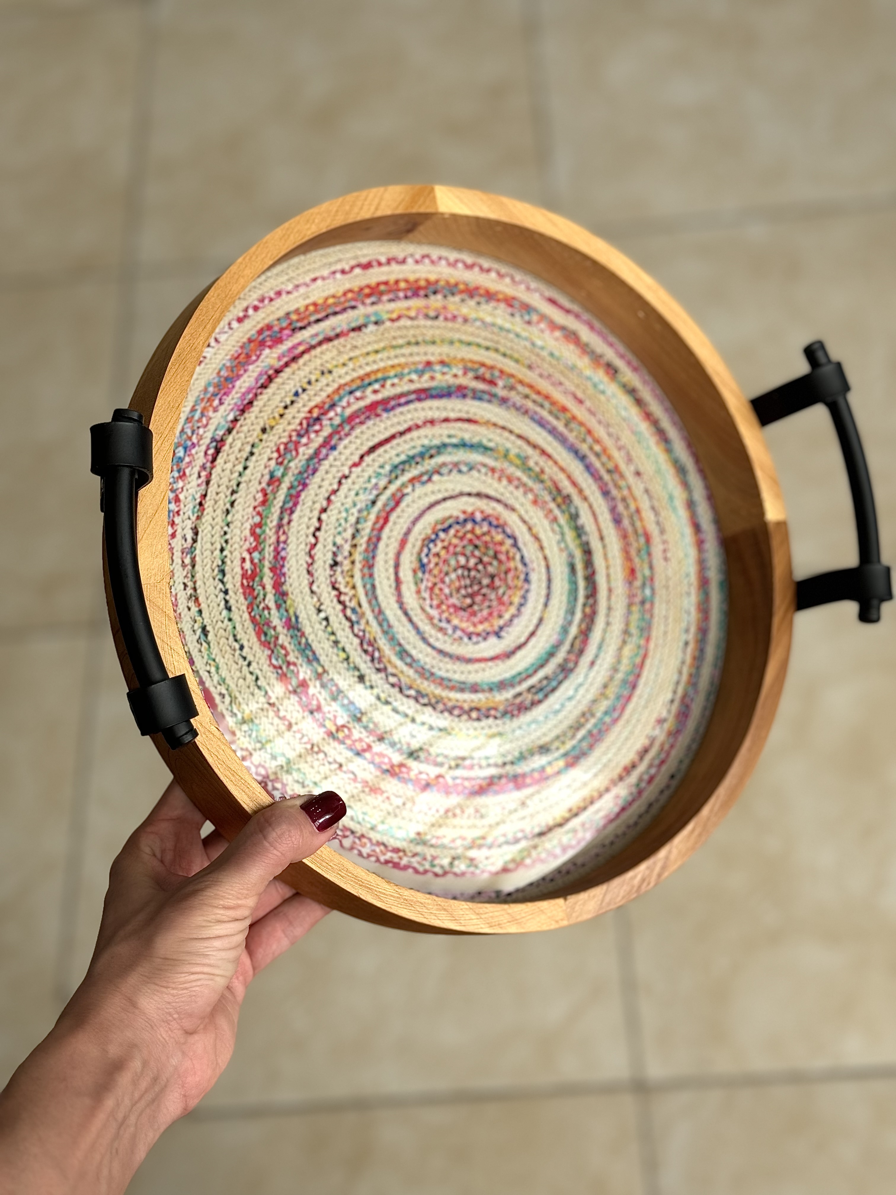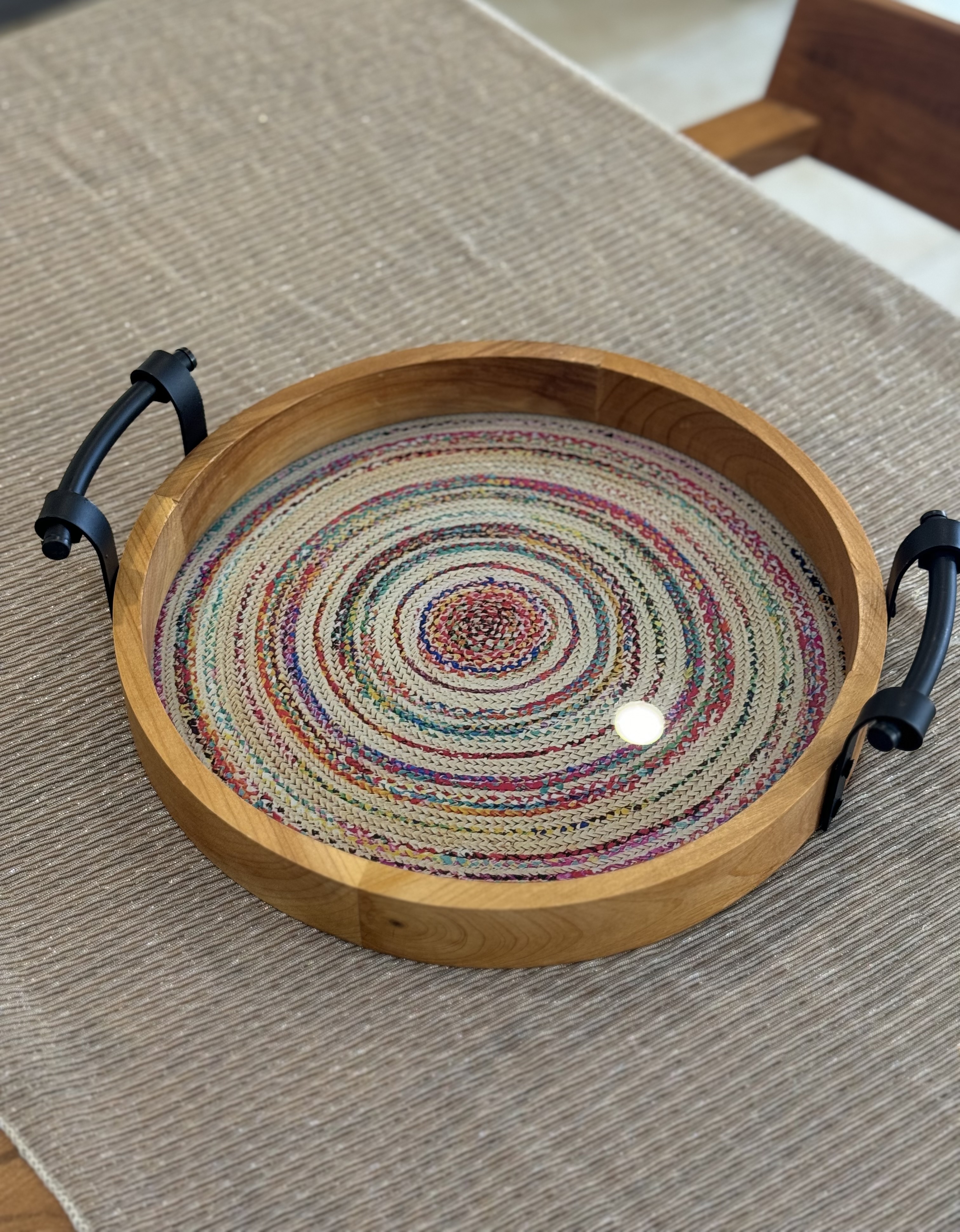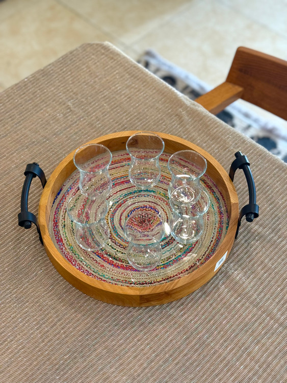 سینی گرد چوب عود با دسته فلزی انتخابی کاربردی و زیبا برای سرو چای، قهوه، دسر و پذیرایی است. یکی از خاص ترین مدل های سینی موجود در بازار قطعا این کار است؛ دور کار چوب بسیار باکیفتی دارد و کف کار روی عکس سه بعدی رنگی شیشه کار شده است؛ همچنین دسته ی کار فلزی روکش کوره است. این سینی یک انتخاب شیک و خاص برای جهیزیه و هدیه نیز هست.