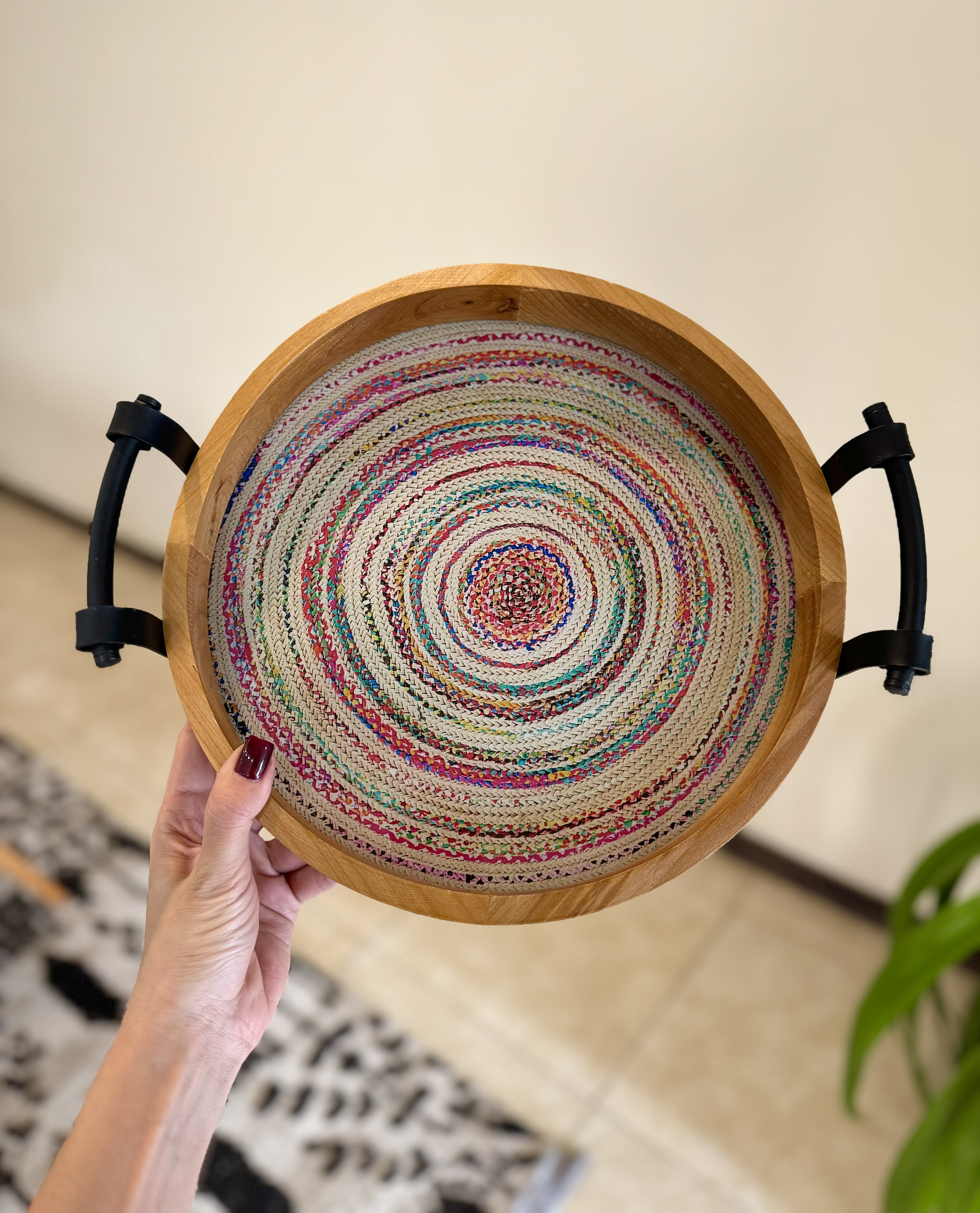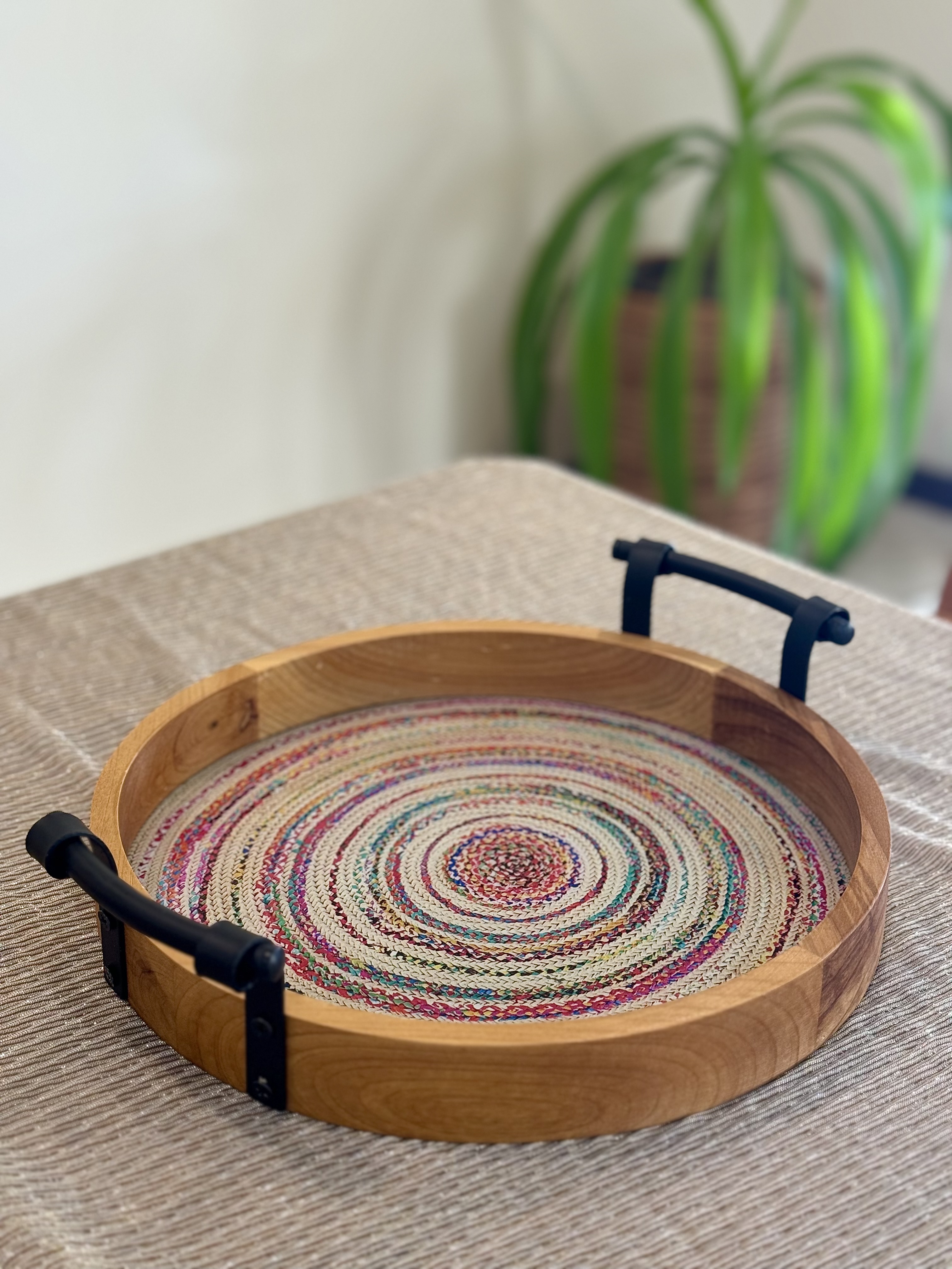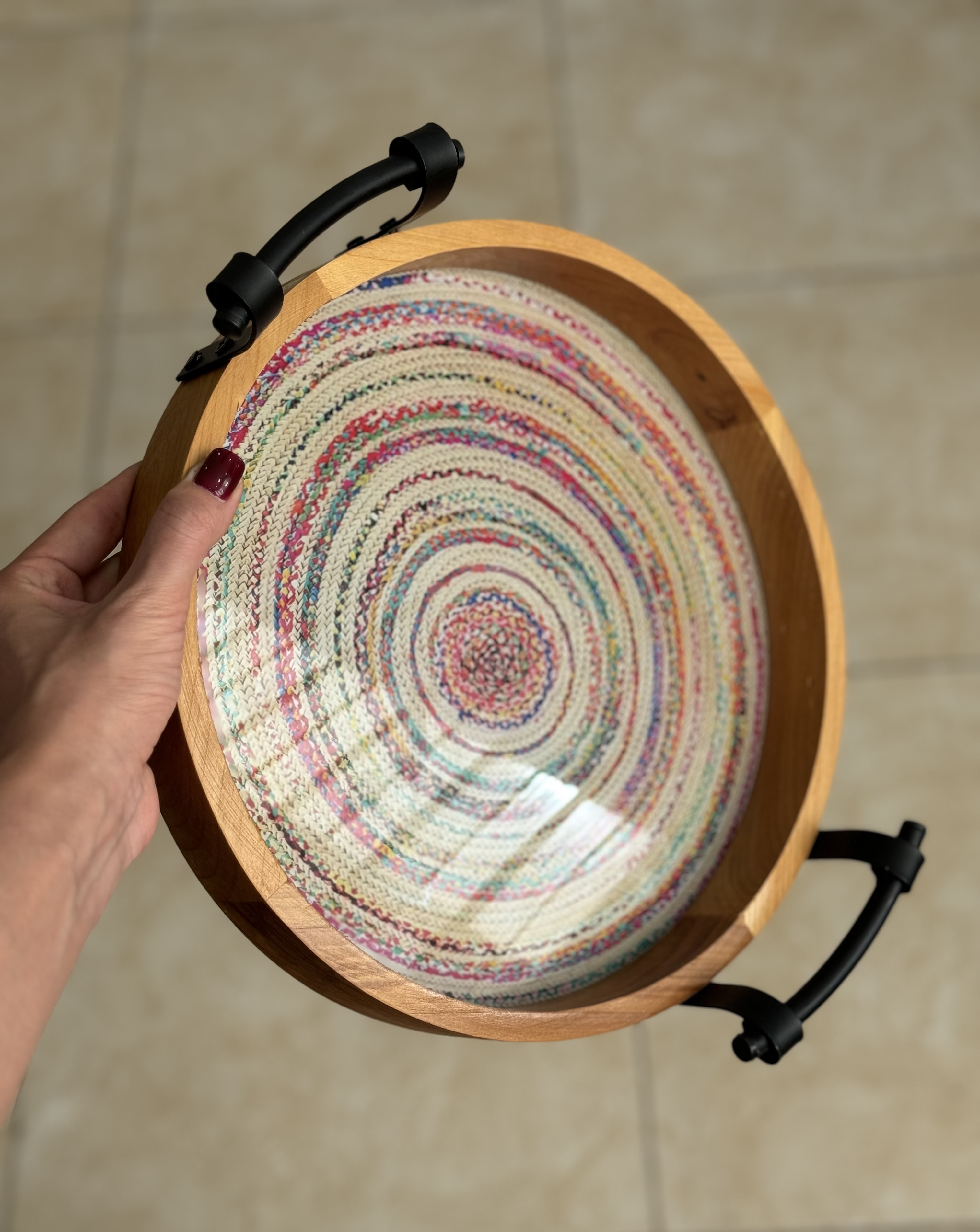 سینی گرد چوب عود با دسته فلزی انتخابی کاربردی و زیبا برای سرو چای، قهوه، دسر و پذیرایی است. یکی از خاص ترین مدل های سینی موجود در بازار قطعا این کار است؛ دور کار چوب بسیار باکیفتی دارد و کف کار روی عکس سه بعدی رنگی شیشه کار شده است؛ همچنین دسته ی کار فلزی روکش کوره است. این سینی یک انتخاب شیک و خاص برای جهیزیه و هدیه نیز هست.