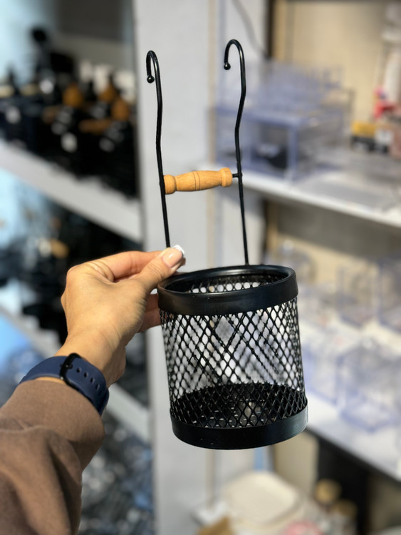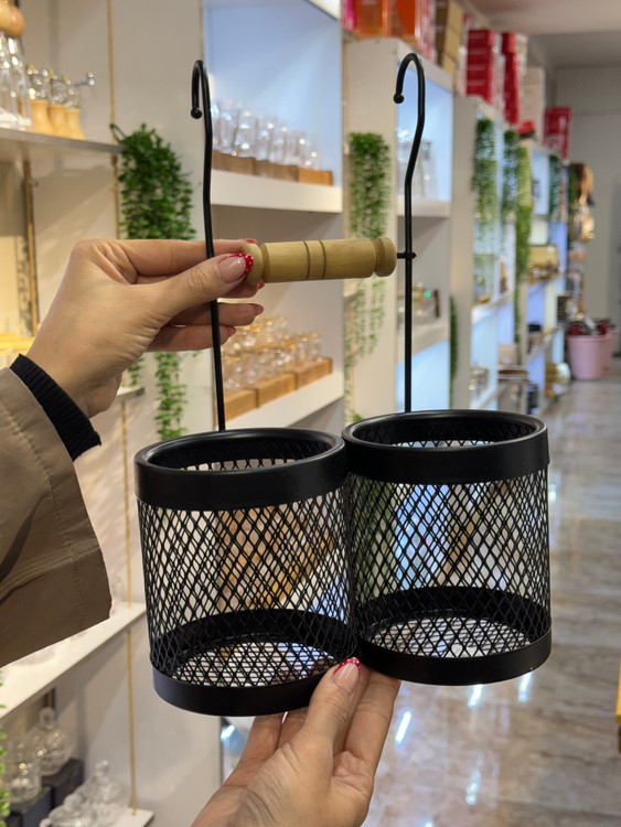 جا قاشقی آویز فلز و چوب انتخابی مناسب برای مرتبسازی قاشق، چنگال و ابزار آشپزخانه در فضای کنار سینک یا دیوار است. ترکیب بدنه فلزی با جزئیات چوبی، ظاهری ساده و هماهنگ با دکورهای مدرن و مینیمال ایجاد میکند.